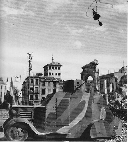 On peut également voir les barricades de sacs hachés par les balles, celles moins communes formés de selles sûrement récupérés dans une écurie de cadets de l'Alcazar. Enfin on peut apercevoir un blindé, équipé d'une mitrailleuse hotchkiss, dont l'équipage est sûrement ces miliciens sans brelage qui se reposent au soleil. A noter un membre de l'armée régulière resté fidèle à la république, un sous-officier, qui souvent s'épuisait à commander des miliciens motivés mais sans expérience militaire...